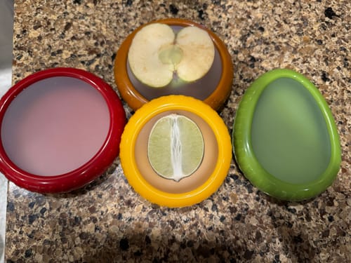 Adoro estes produtos para guardar meia cebola, tomate, limão ou abacate (para citar alguns)! Faço saladas quase todos os dias e é fácil guardar metade das minhas frutas ou legumes para o dia seguinte. São fáceis de lavar e duram muito tempo. Tenho o meu conjunto há anos e ainda estão em ótimo estado.
