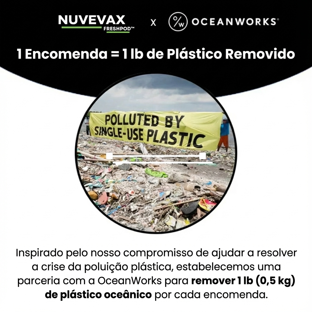 RESOLVENDO A CRISE DA POLUIÇÃO: Embora o Nuvevax FridgePod™ evite o desperdício futuro de plástico, a poluição existente continua a prejudicar os nossos oceanos... Mais de 100 milhões de animais marinhos são prejudicados anualmente e os microplásticos estão agora até mesmo nos nossos alimentos! É por isso que fizemos uma parceria com a OceanWorks para remover 0,5 kg de plástico do oceano por cada encomenda - combatendo tanto o desperdício do futuro como a crise do presente.